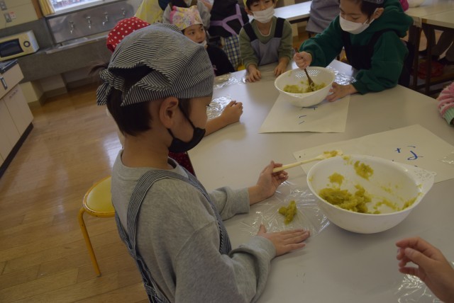 少し柔らかめにボランティアさんがふかしてくれたサツマイモを「一人10回ずつ」すりこぎ棒でつぶします。けんかにならないための回数なのですが、子どもたちは大切なサツマイモ、自分たちの料理なので、必死です。数を数えながら順番につぶしました。