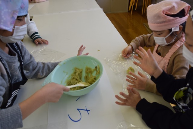指でつくる「これくらいのまる」くらいのサツマイモをサランラップにとり、丸めます。あれ?よく見ると、「これくらいのまる」が人より大きい子がいますよ。その気持ち、わかるなぁ。