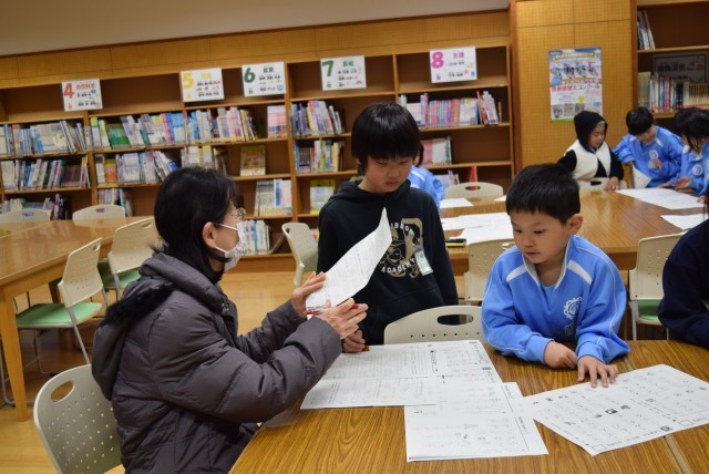 1,2年生は、今日も朝学習でプリントに取り組み、地域の丸付け先生に見てもらいました。回数をこなすこと、励ましてもらうことが、学習の意欲につながっています。