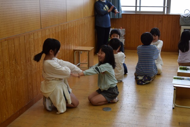 3年生は、手遊び歌「茶つみ」を2~3人でリズムに乗って歌っていました。自分たちで考えたかけ声で振りを覚えたようで、そのかけ声が楽しくて楽しくて、音楽室いっぱいに笑い声が響いていました。