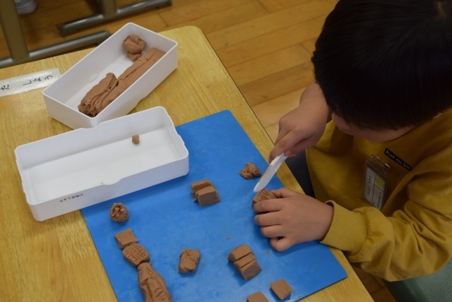 1年生は、ねんどでお店屋さんをつくっていました。細やかに商品を作り、楽しそうにしています。話しかけると、次から次へと自分のつくっているものやお店、好きなものについてお話ししてくれます。手の感覚と想像力で、自分の世界にとっぷりと浸ることは、低学年の児童にとってとても大切です。のびのびと表現する、自分なりに楽しめること、大事な学習です。
