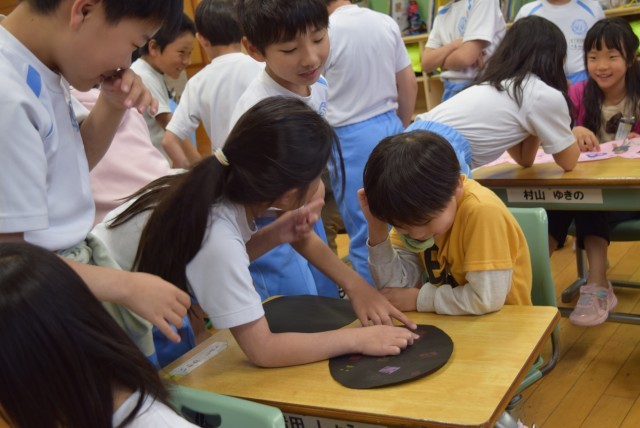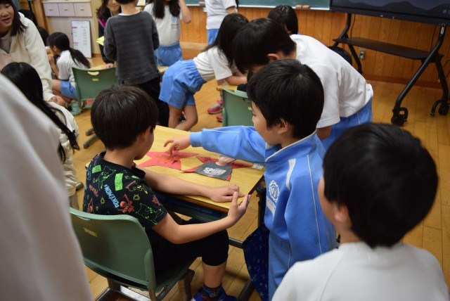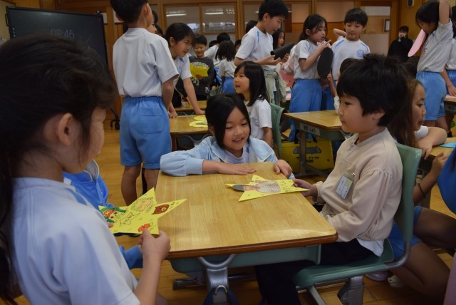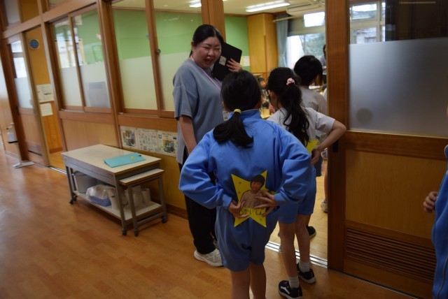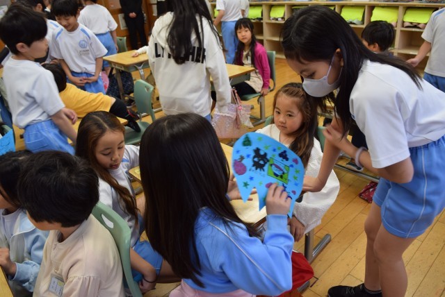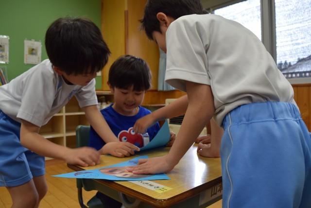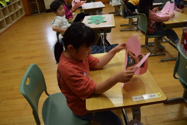 一人一人の顔写真や名前、メッセージや好きな物の絵などを星型やハート型に切ったカードに、書いたり貼ったりして、かわいらしいメッセージカードを作りました。1年生は12人、3年生は36人です。1人の1年生に3人の3年生がついて、カードを渡したりお話をしたりしてふれあいました。
