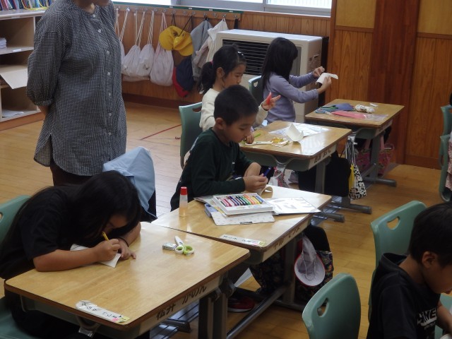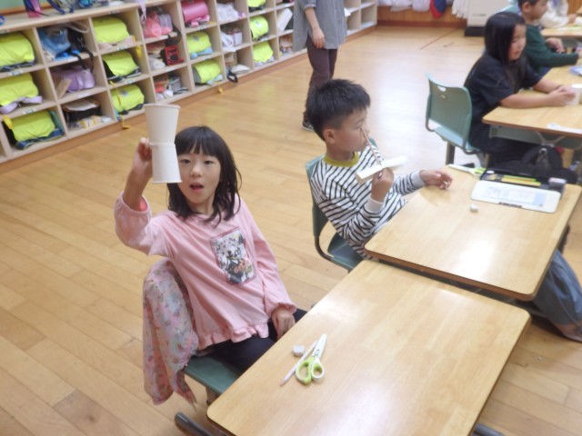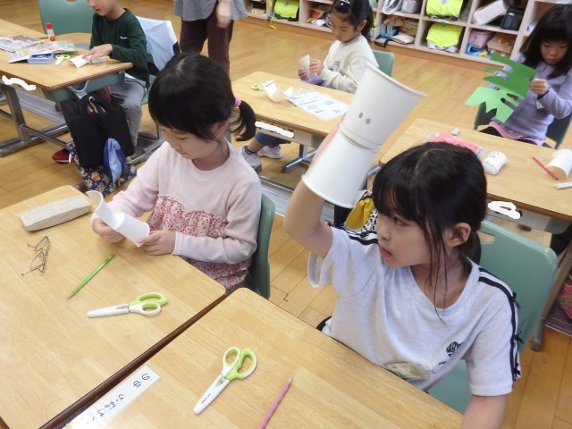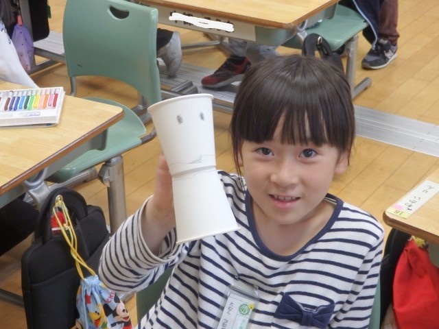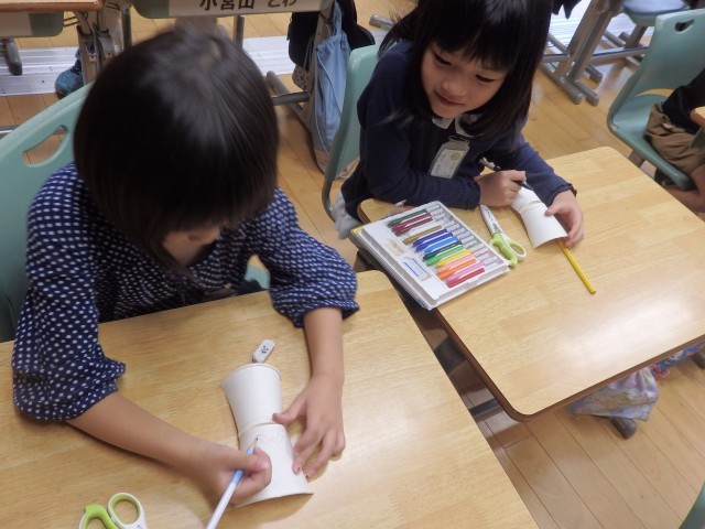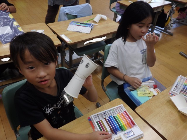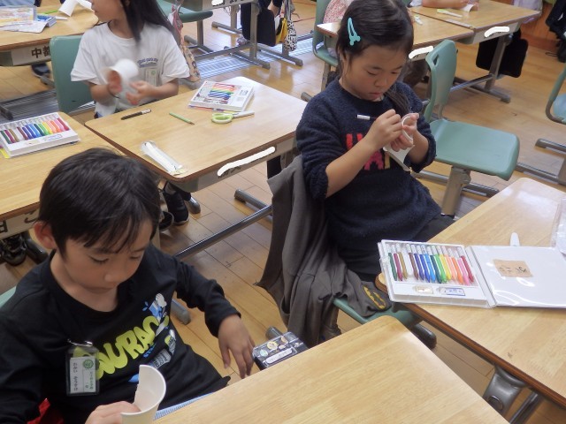 10/9 パクパックン 公開日 2024/10/09 更新日 2024/10/09 教育活動 1年2組の5時間目は図工の授業でした。紙コップに顔を描いて「パクパックン」づくりです。鉛筆やクーピーを使って目鼻を書いたり、折り紙を切り貼りして飾りを付けたりしていました。パクパクと口を動かしてみたりもして楽しそうでした。 +5 いいね(0)