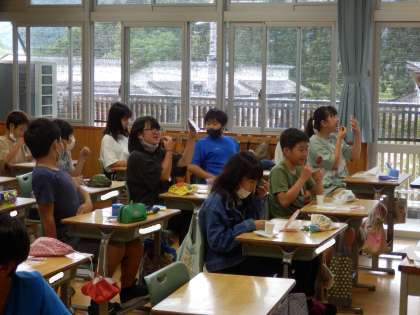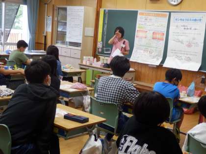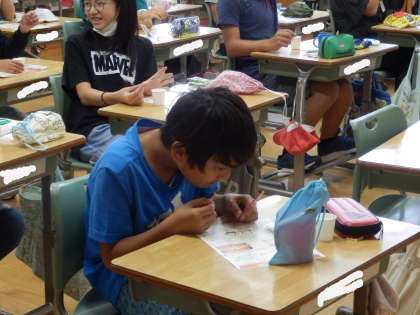 6年生の歯肉炎予防教室の様子です。染め出しをしています。