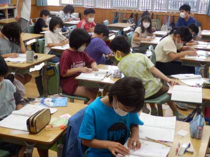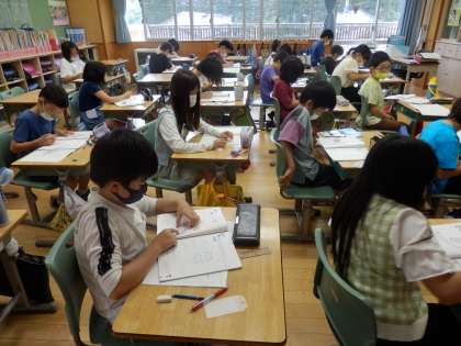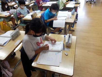 4年生は算数の授業でした。180度以上の角の角度の測り方について、分度器を使いながら学習していました。問題を早く解き終わった人同士で確かめをしています。