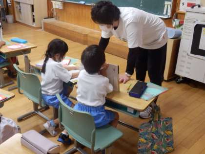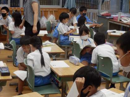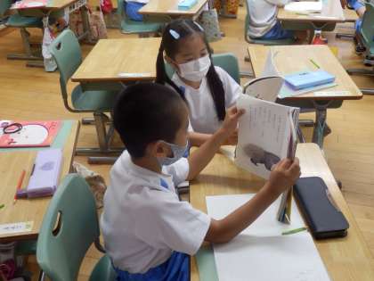 1年生の1時間目は国語の授業でした。「どうやって身を守るのか」という教材をスラスラ読めるようになるために、音読練習です。個人で練習をした後に、ペアでまる読みをしていました。「上手だね!」「いいね」とお互いに褒め合いながら仲良く音読していました。
