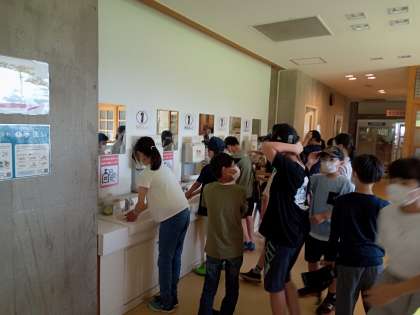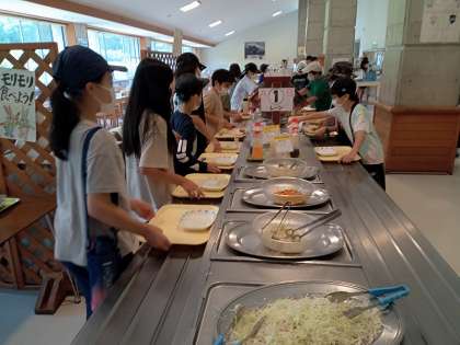 今日の昼食が、自然の家での最後の食事でした。手洗い消毒をしっかりと済ませ、いざ好きなものを皿にとります。ラーメンに長い列ができていました。