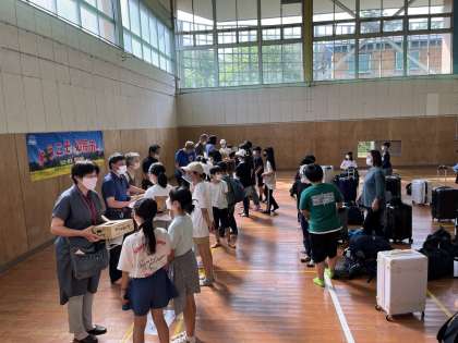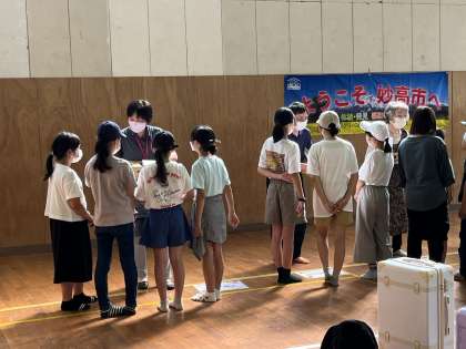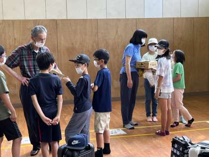 こどもたちから民泊先の方へおみやげの八色産しいたけを。よろしくお願いします。