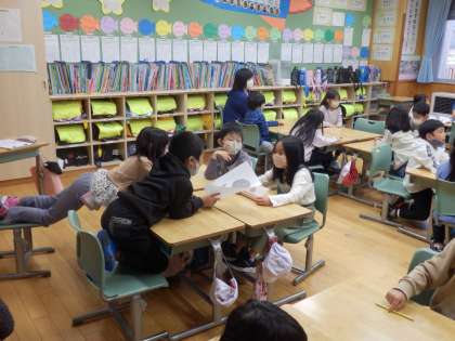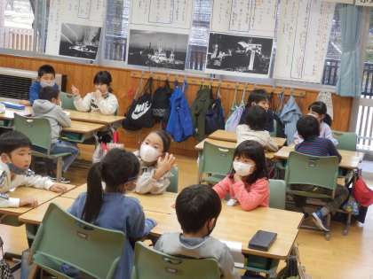 11/15 班の話し合い活動 公開日 2022/11/15 更新日 2022/11/15 教育活動 1年生の4時間目は生活の授業でした。たくさんあるアサガオの種をどうしたらよいか班で話し合いをしていました。班ごとで司会と書記を決め、それ以外の人には「自分の意見を言うことと友達の意見を聞くという大事な仕事があるんだよ。」という先生のことばに「やった!」と喜ぶ子がたくさんいました。 いいね(0)