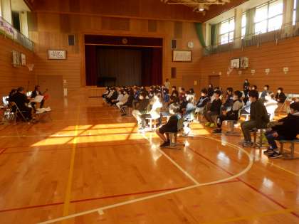 高学年の楽しい笛の音楽会の様子です。5,6年生は「チッチェーノ」は覚えていたようです。6年生へ送る曲と言うことで卒業合唱の候補曲にもなっていた「旅立ちの日に」が演奏されました。私も大好きな曲で、イントロを聴くだけで涙が出そうになります。