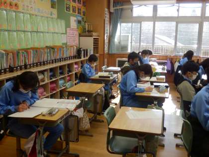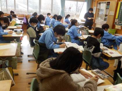 6年生は国語の授業でした。国語辞書を使って「復旧」「錯覚」「気がとがめる」などの言葉の意味を調べていました。