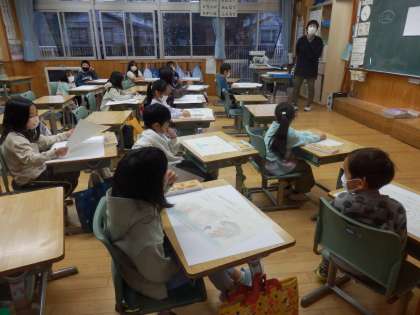 11/24 お話から生まれたよ 公開日 2022/11/24 更新日 2022/11/24 教育活動 昨日まで臨時休校としておりましたが、学校を再開いたしました。1年生の1時間目は図工の授業でした。「お話から生まれたよ」の下絵ができたので、画用紙に清書をしていきます。 いいね(0)