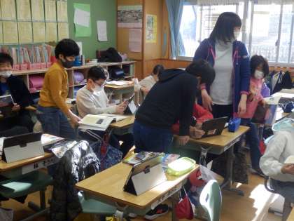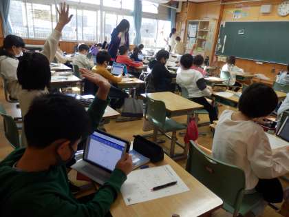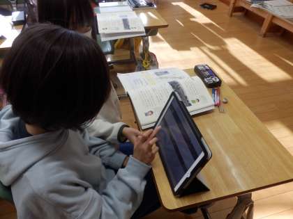 4年生は社会の授業でした。南魚沼市の八色原の開拓について資料集の中から自分たちでクイズを作って、オクリンクで共有していました。