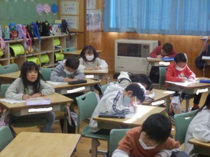 12/9 長さを求める 公開日 2022/12/09 更新日 2022/12/09 教育活動 1年生は算数の授業でした。テレビの画面に映し出された例題をもとに、ワークシートに取り組んでいました。画面を食い入るようにジッと見ながら、一生懸命取り組んでいました。 いいね(0)