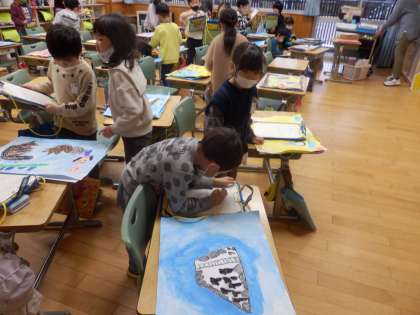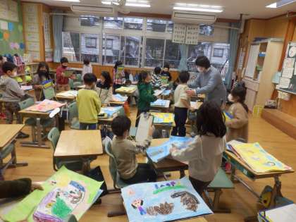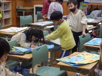 1年生の1時間目は図工の授業でした。これまでに描いた絵の中で自分のお気に入りを1枚選びます。その後、隣の人+それ以外に自分が「いいな」と思った人の絵、合計3枚を選んで、どこが気に入ったところなのか書いていました。