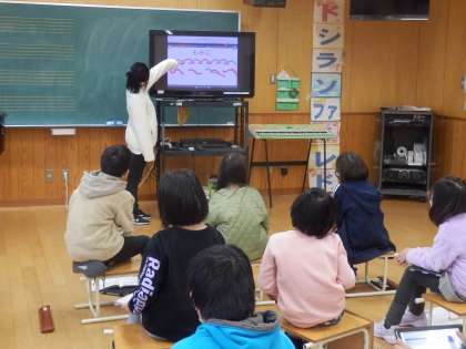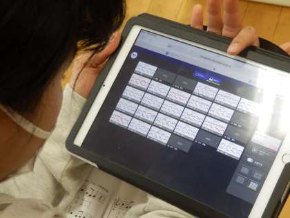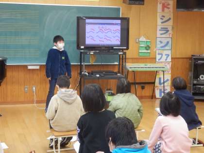 4年生は音楽の授業でした。「もみじ」の主旋律と低音パートの旋律を図で表し、iPadのオクリンクで見合ったり、発表したりして、旋律の違いを確認していました。