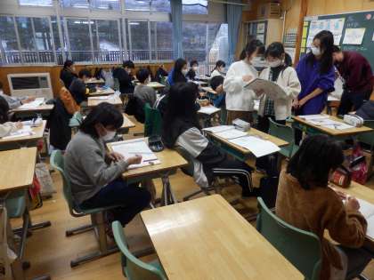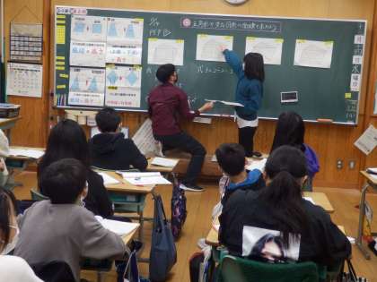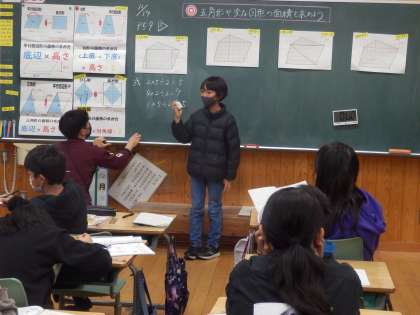 12/14 複雑な形の面積 公開日 2022/12/14 更新日 2022/12/14 教育活動 5年生は算数の授業でした。複雑な形の五角形の面積の求め方を考えていました。3つの三角形に切り分けたり、三角形と台形に切り分けたりなど、いろいろな求め方が出されました。 いいね(0)
