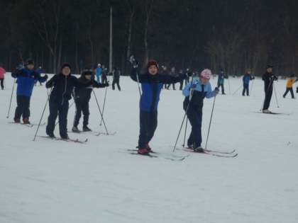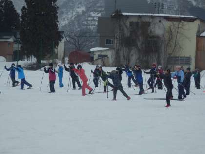5,6年生の5,6時間目はクロカンスキー授業でした。予報は雪でしたが、あいにくの雨の中の授業でした。今日はグラウンドで、ダイアゴナル、滑走、一歩滑走の基本的な練習を行いました。一歩滑走はだいぶ難しかったようです。