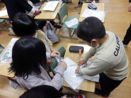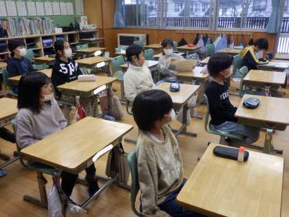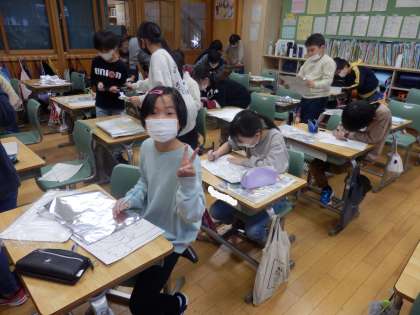 3年生の6時間目は図工の授業でした。自分で描いた絵にアルミホイルやエアクッション(いわゆるプチプチ)、毛糸などを貼り付けて作品を仕上げていきます。自分の作品を受け取るとき、机の上に何もなく、全員の姿勢がよい列から受け取りに行っていました。子ども達から「机の上!」「姿勢!」と声を掛け合う姿がありました。