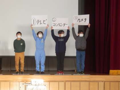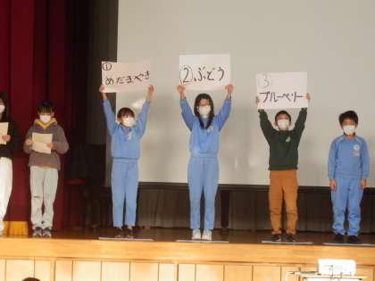 1/19 目に関するクイズ 公開日 2023/01/19 更新日 2023/01/19 教育活動 今日は児童朝会でした。保健委員会が「目」に関する3択クイズを5問出題し、全校児童がそれに答えます。全問正解できたでしょうか。 「目は1日中働いているので、特に寝る前のメディアはさらに目を疲れさせることになります。メディアを控え、しっかり睡眠を取りましょう。」と呼びかけがありました。目や脳、心の健康のためにもメディアとの付き合い方についてお子さんとご確認ください。 いいね(0)