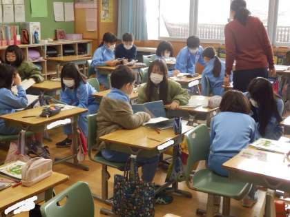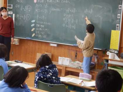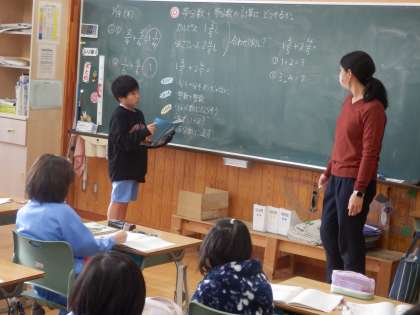 4年生は算数の授業でした。帯分数+帯分数の計算の仕方について考えていました。近くの人と教え合ったり、隣同士でどうやったか確認をしていました。「整数は整数、分数は分数で計算する」、「過分数に直して計算する」の2通りの考え方が出されました。