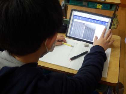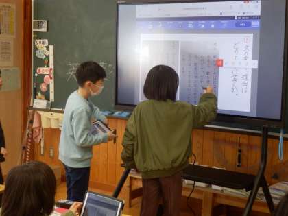 4年生の3時間目は国語の授業でした。電子黒板とタブレットを使って、2人の意見文の違いはどこか考える授業でした。「違いが分かるところを線で引いてください。」と担任の先生が言うと、「(電子黒板に)書きたい、書きたい!」とアピールする子ども達でした。