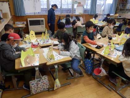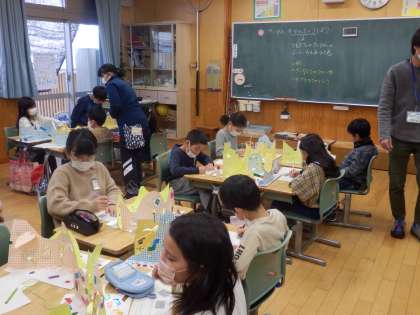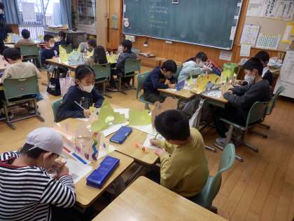2年生の5時間目は図工の授業でした。完成した「窓のある建物」を班ごとで鑑賞します。鑑賞カードには「工夫してあるところ」「よいところ」などを記入します。たくさん見つけて書けたでしょうか。