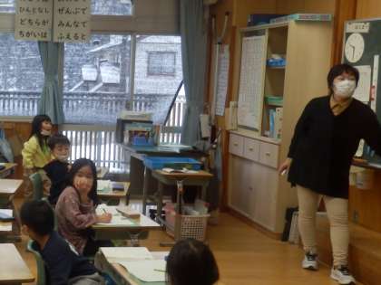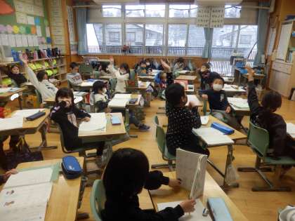 1年生は国語の授業でした。カ、タ、リ、ヤ以外のひらがなに似ているカタカナを探して発表していました。廊下側の窓に貼ってあるカタカナ表を一生懸命探している子もいました。「ウ」「ヘ」「ラ」などたくさん意見が出されました。