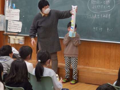 3/2 にょきにょきの箱の発表 公開日 2023/03/02 更新日 2023/03/02 教育活動 1年生は席替えの後、図工で作った「にょきにょきの箱」をみんなの前で発表しました。「見てほしいところ」や「うまくできたところ」を言ってから、「にょきにょき」をふくらませると・・・。全員の作品を載せられないのが残念です。 いいね(0)