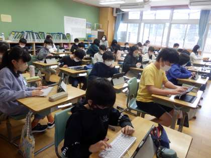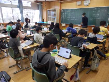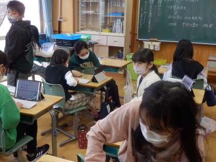6年生は総合の授業でした。修学旅行で行く佐渡について、iPadで調べ学習をしていました。金山などの面白そうな場所を見つけては、お互いに見せ合っていました。