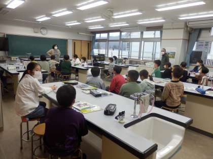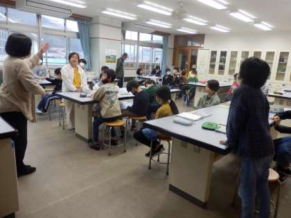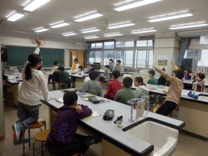 4年生の2時間目は理科の授業でした。最初の授業なので、先生への質問タイムで、いろいろな質問をしていました。みんな、興味津々で手を挙げていますね。