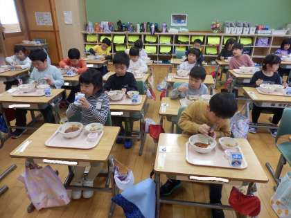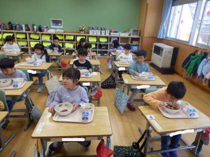 1年生にとっての初めての給食メニューはハヤシライスと海藻サラダとイチゴゼリーでした。