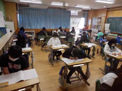 6年生は1〜3限まで全国学力学習状況調査を行います。教科は国語、算数、理科の3教科です。基礎的な問題だけでなく、長い文章を読み取る問題や自分の考えを書く問題もあります。粘り強く取り組んでほしいです。