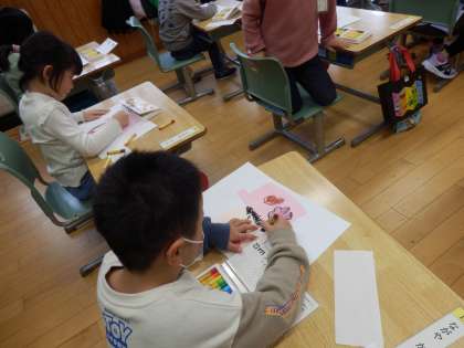 1年生の1,2時間目は図工の授業でした。「春の帽子」というテーマで帽子をかぶった自分の顔をクレパスで描き、帽子に春らしい模様や絵で飾り付けをしていました。かわいらしい顔がたくさんできました。