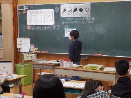 6年生は算数の授業でした。「5種類のお菓子から2種類買います。全部で何通りありますか」という問題に取り組んでいました。1人1人にミニホワイトボードが配られ、子ども達はそれに書き込みながら、組み合わせを書き出したり、表にしたり、図で描いたりしながら考えていました。