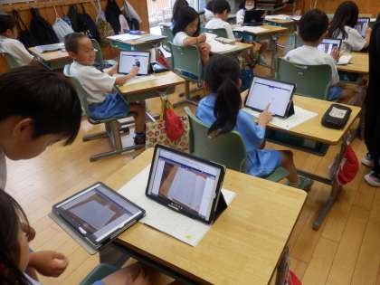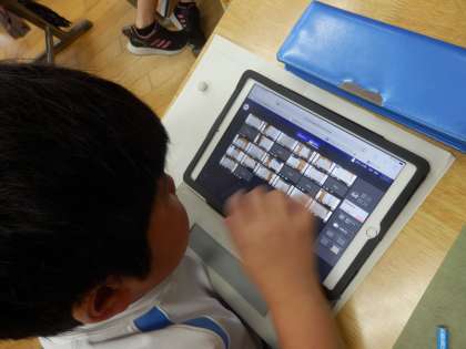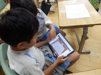 2年生の3時間目は国語の授業でした。「こんなことをしているよ」という教材に合わせて、自分が家でしていることについて作文をしました。書きあがった作文をiPadで写真に撮り、オクリンクというアプリで先生に提出すると、クラス全員がみんなの作文を読めるようになります。他の人が書いた作文を読んで、よいところを取り入れてみることも国語力の向上につながります。