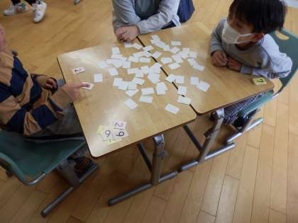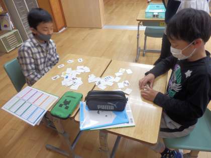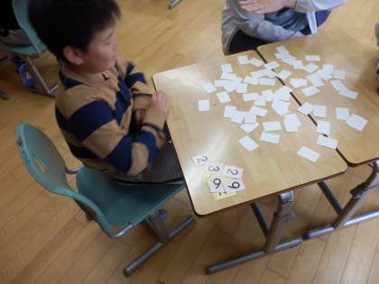にじいろ学級2組の1時間目は算数の授業でした。2人ペアでカードゲームをしながら九九の学習をしていました。裏返しで広げてあるカードから2枚選んで表にします。そこに書かれた数字を九九で計算して、言えたらカードゲットです。子ども達は楽しみながら九九の学習をしていました。