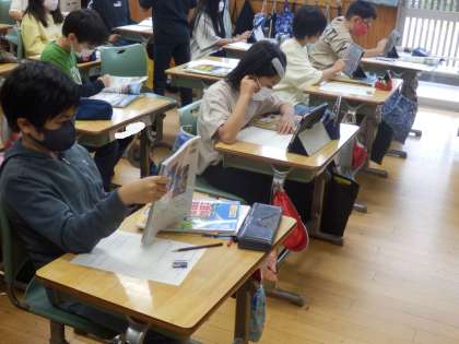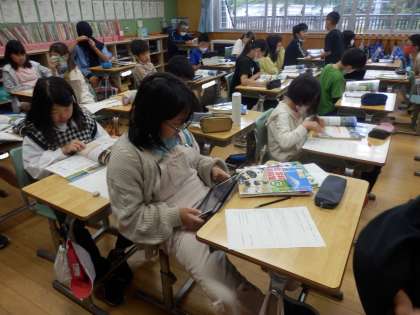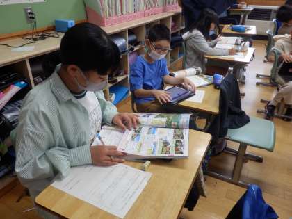5年生の1時間目は社会の授業でした。野辺山原や嬬恋村などの高地での農業の特徴について調べていました。教科書や資料集、iPadを使って調べ、分かったことをプリントにまとめていました。書かれている文章をコピペしないことがポイントです。