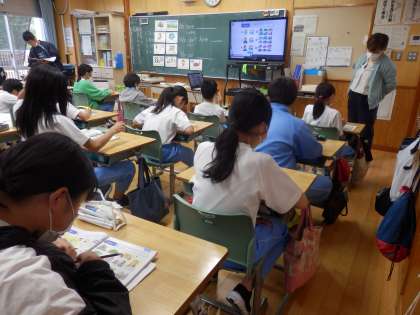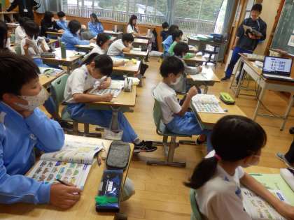 6年生の1時間目は国際科の授業でした。自分たちの町にあるものやないもの、そして何ができるかという表現について学習しました。まずは教科書の聞き取り問題に取り組みました。外国の人が話す早い英語でもしっかり聞き取れていました。