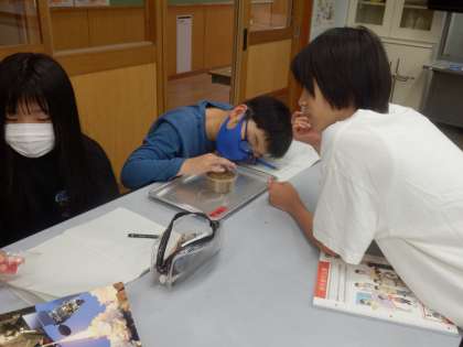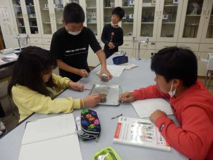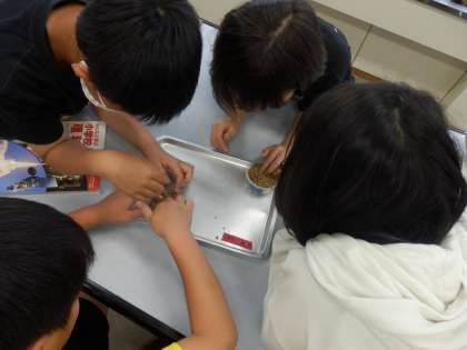 5年生の2時間目は理科の授業でした。「水あり」と「水なし」、「肥料あり」と「肥料なし」にように反する条件をつけた2つのカップに種を植えて、発芽の条件について考察していました。