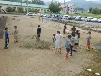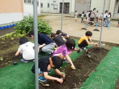 4年生の1時間目は理科の授業でした。今までベランダでポットで育ててきたヘチマをいよいよ畑に植えました。植える人たちとネットの準備をする人たちに分かれ、協力しながら取り組んでいました。