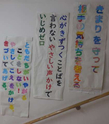 6/13 いじめをしない、見逃さないスローガン 公開日 2023/06/13 更新日 2023/06/13 教育活動 各学年で話し合って決めたいじめ見逃しゼロのスローガンを1階から2階へ上がる階段に掲示しました。ご来校の際はぜひご覧ください。 いいね(0)