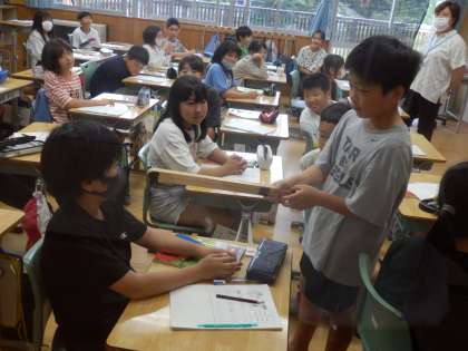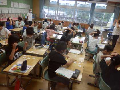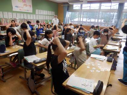 5年生の1時間目は国際科の授業でした。1人の子が先生役になり、マイク代わりの棒を持って「せーの!」と言うと、みんなで「What subject do you like?」と質問をするという活動を行っていました。その後、教科名カードを使ってカルタ取りで大盛り上がりでした。