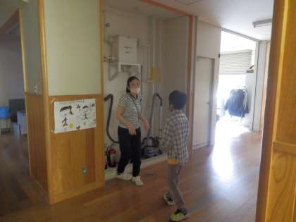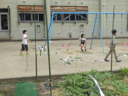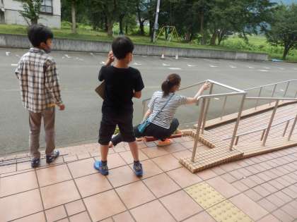 にじいろ学級2組の子ども達も台形と平行四辺形を探していました。にじいろ学級の子達は外のブランコや二宮金次郎像にも台形と平行四辺形を見つけていました。視点がすごいです。