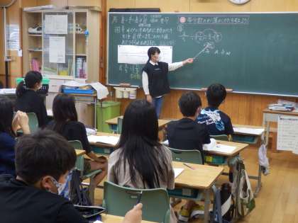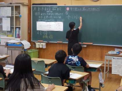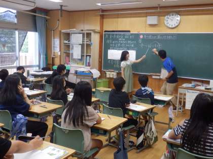 6年生の2時間目は算数の授業でした。2/5÷1と1/3という帯分数の計算を1人の子が黒板で解きます。それを2人の子がどういう計算をしたのかみんなに説明していました。説明することで自分の理解も確かなものになります。