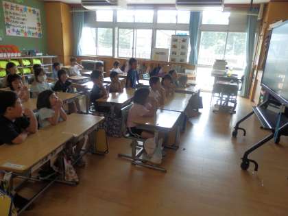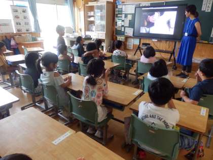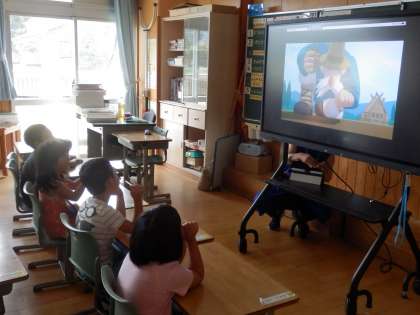 1年生の4時間目は国語の授業でした。「大きなかぶ」のビデオを視聴しました。教科書で書かれていたことと比較しながら見入っていました。