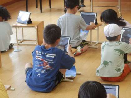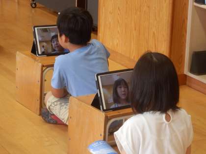 1年生の5時間目は音楽の授業でした。「海」の歌のテストの時間です。iPadの録画機能を使って、1人1人が「何番を歌うのか」「どこを強く歌うのか」を言ってから、そこに気をつけながら歌います。歌い終わったら、録画したものを先生にオンラインで提出しました。