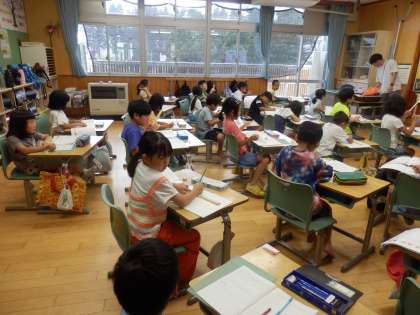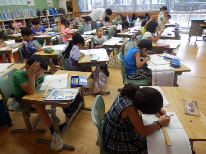 2年生の4時間目は算数の授業でした。竹ものさしを使って、決められた長さに正しく直線をひく学習をしていました。前の時間にやった竹ものさしの読み方が理解できているかどうかがポイントです。