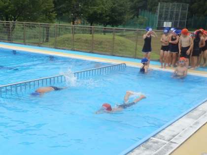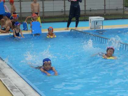 1,2年生の3,4時間目は水泳授業でした。授業としての水泳は今日が最後になります。グループごとにけのびやバタ足の検定を行いました。