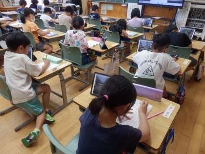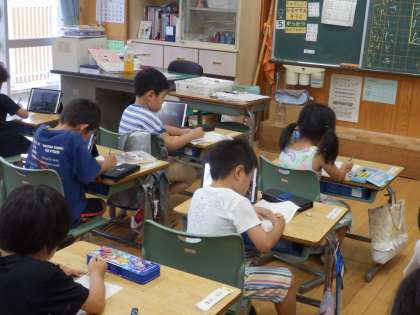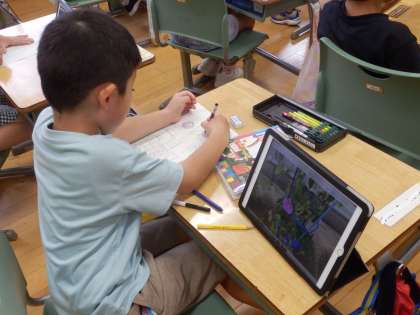 1年生の3時間目は生活の授業でした。アサガオの様子を写真に撮り、その写真を見ながら観察日記を書いていました。クーピーで色塗りしながらスケッチを描いたり、花の数など気づいたことを文章で書いていました。